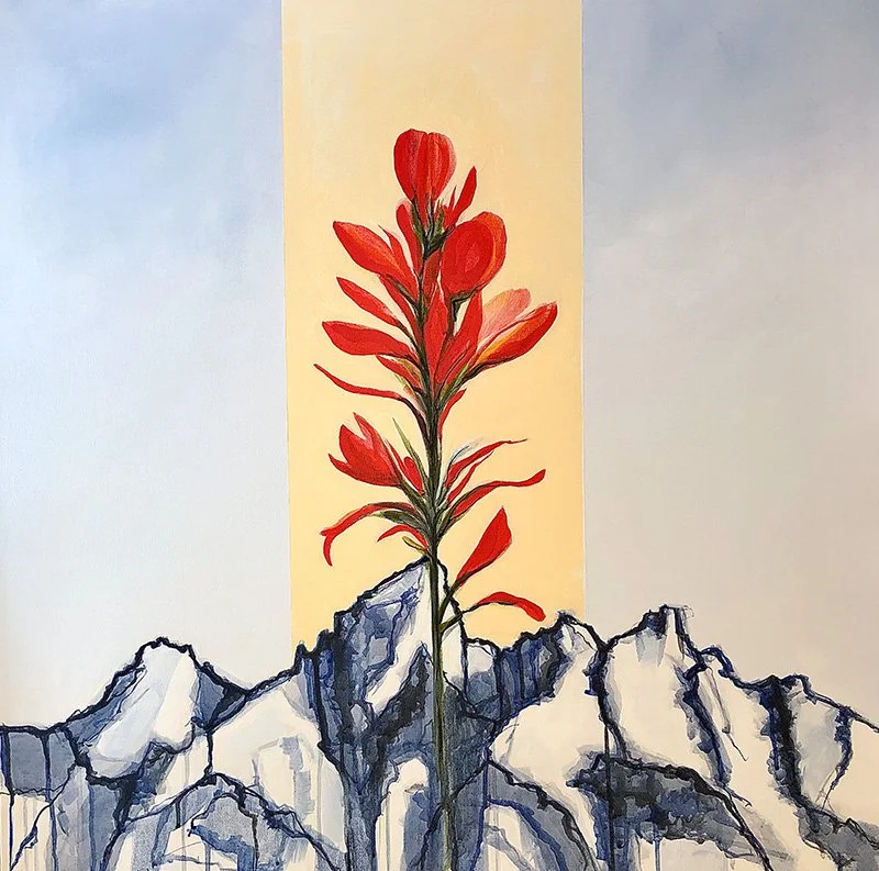 My most favorite mountains in the world are the Tetons in Jackson Hole, Wyoming. I left this piece as my last in the series of National Parks. The flower is the Indian Paintbrush – another of my favorites.