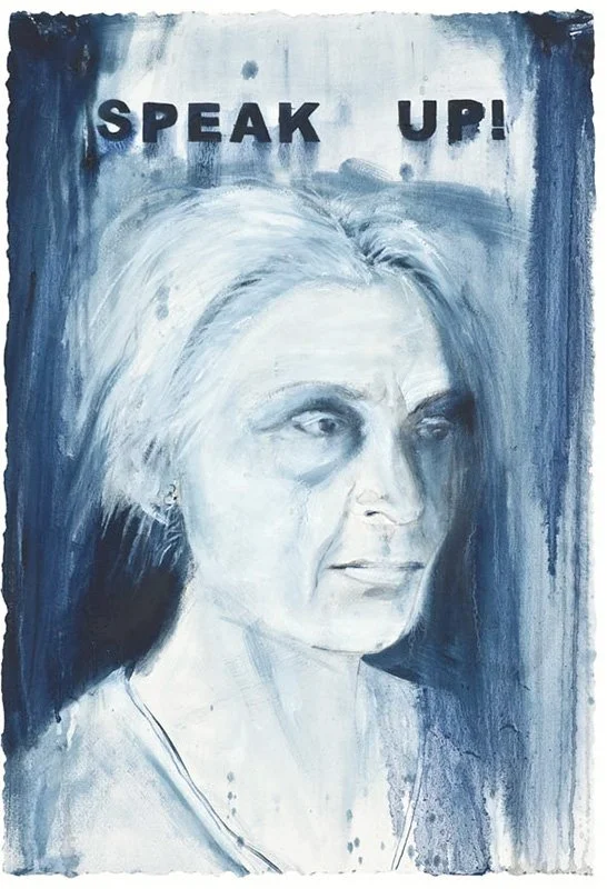 This painting portrays an elder woman who is not afraid to speak up and shout out what is on her mind about injustice. Courage, inner strength, and wisdom hopefully will be found to come together at some point in a woman’s life, and she will then powerfully vocalize her deep kindness, compassion, and love in and for the world.